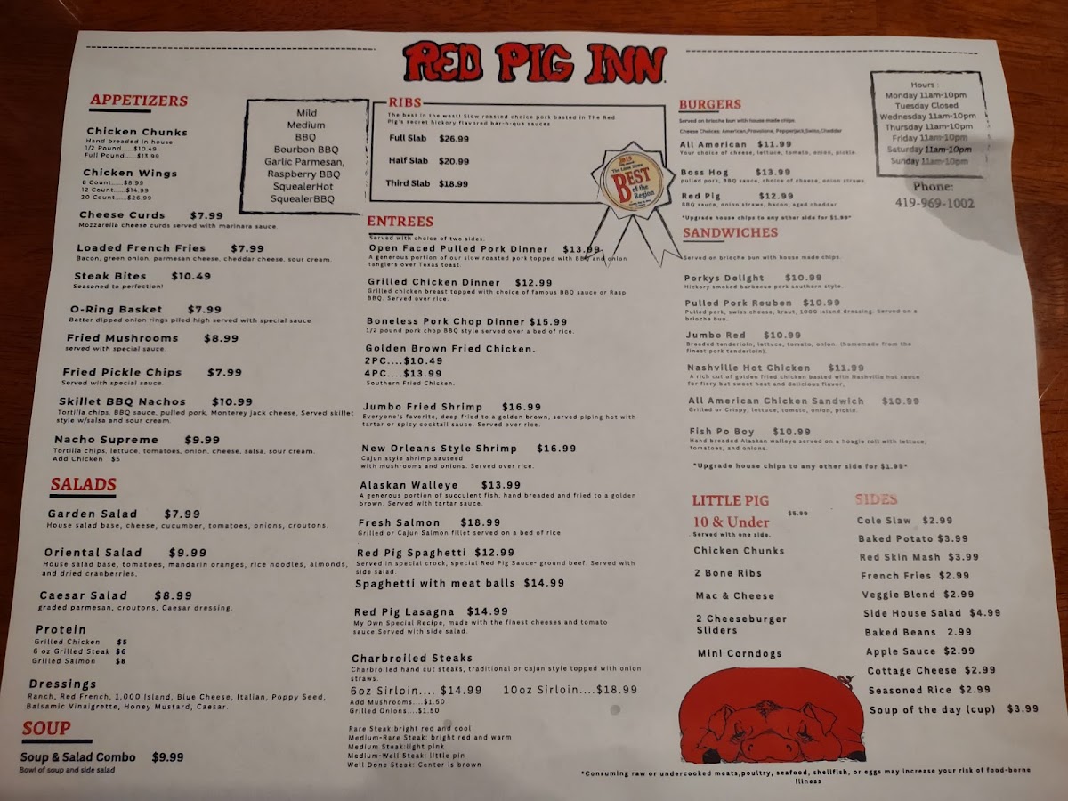 Welcome to Red Pig Inn, a delightful culinary spot in Ottawa, OH, located at 1470 N Perry St. This hidden gem offers a cozy atmosphere and a menu brimming with flavor. Each dish reflects a commitment to quality, with highlights such as their crispy wings, hand-cut fries, and the crowd favorite: house chips topped with cheese and bacon, served with an amazing ranch dressing.